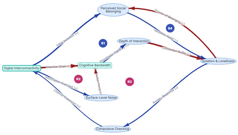 The system’s UI dashboard reports that the social graph is functioning within optimal parameters. The governing logic asserts that increasing Digital Interconnectivity automatically fulfills the human requirement for Perceived Social Belonging.