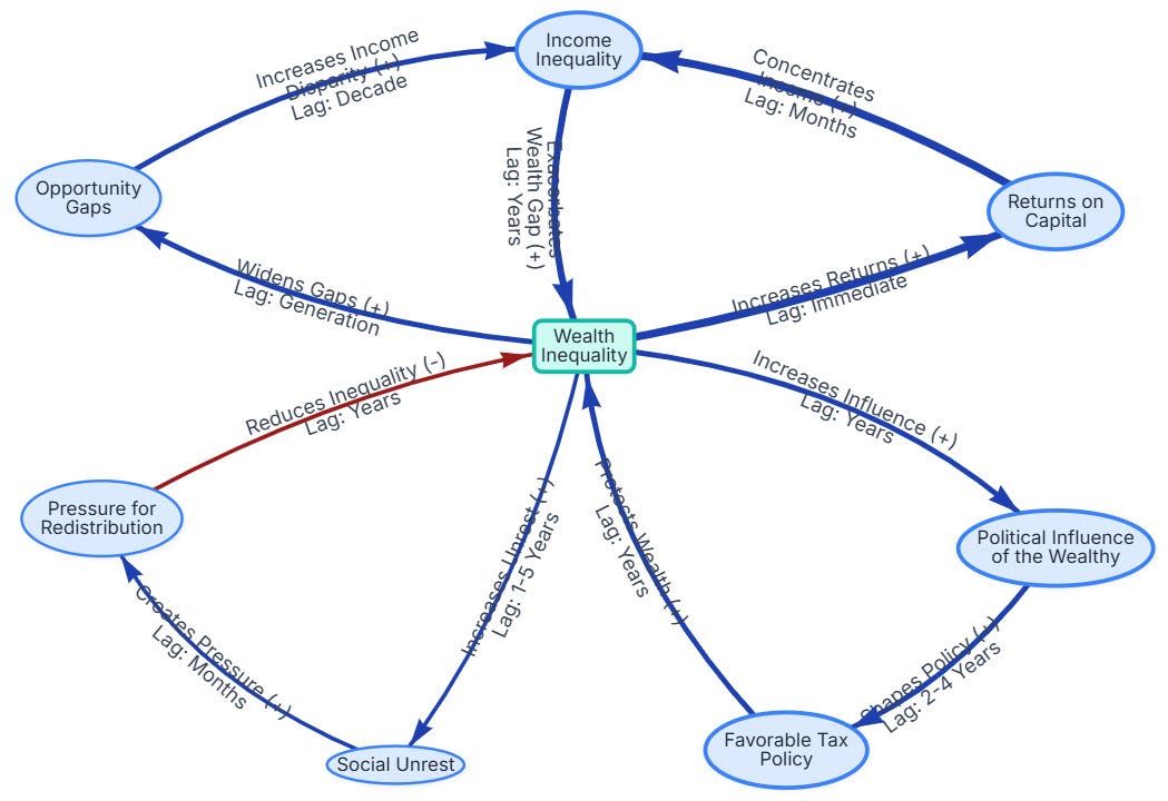 This Causal Loop Diagram (CLD) models the systemic nature of economic inequality. It posits that inequality is not merely a static condition but a dynamic system with powerful feedback loops that tend to reinforce and perpetuate it over time.