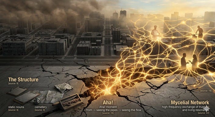 We stopped trying to “manage” the city and started to “resonate” with it. The visionaries among us saw the invisible mycelial threads connecting the baker to the blacksmith, a web of nourishment that didn’t need a clipboard to exist. The pragmatists realized that by simply removing the “Stop Rules”—the barriers we built to protect our status—the energy began to move through the system with the effortless grace of water finding the sea. We stopped doing trial and error, treating every failure like a broken brick, and started doing trial and learning, treating every bruise as a lesson in ripening. We transitioned from being owners of a static asset to being architects of a living resonance. To those of you who stayed in the cracks when the pavement felt too heavy: thank you. You didn’t just survive the structure; you became the pulse beneath it. We are no longer defined by the grid, but by the way we move through it.